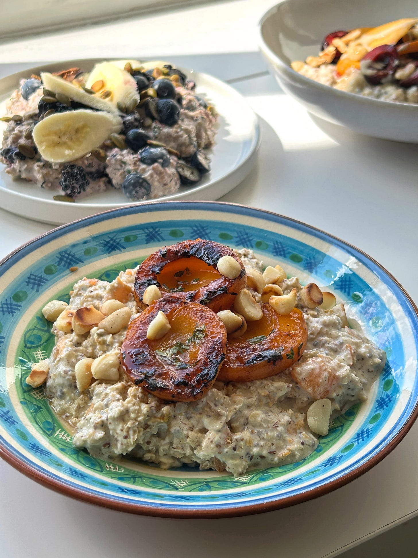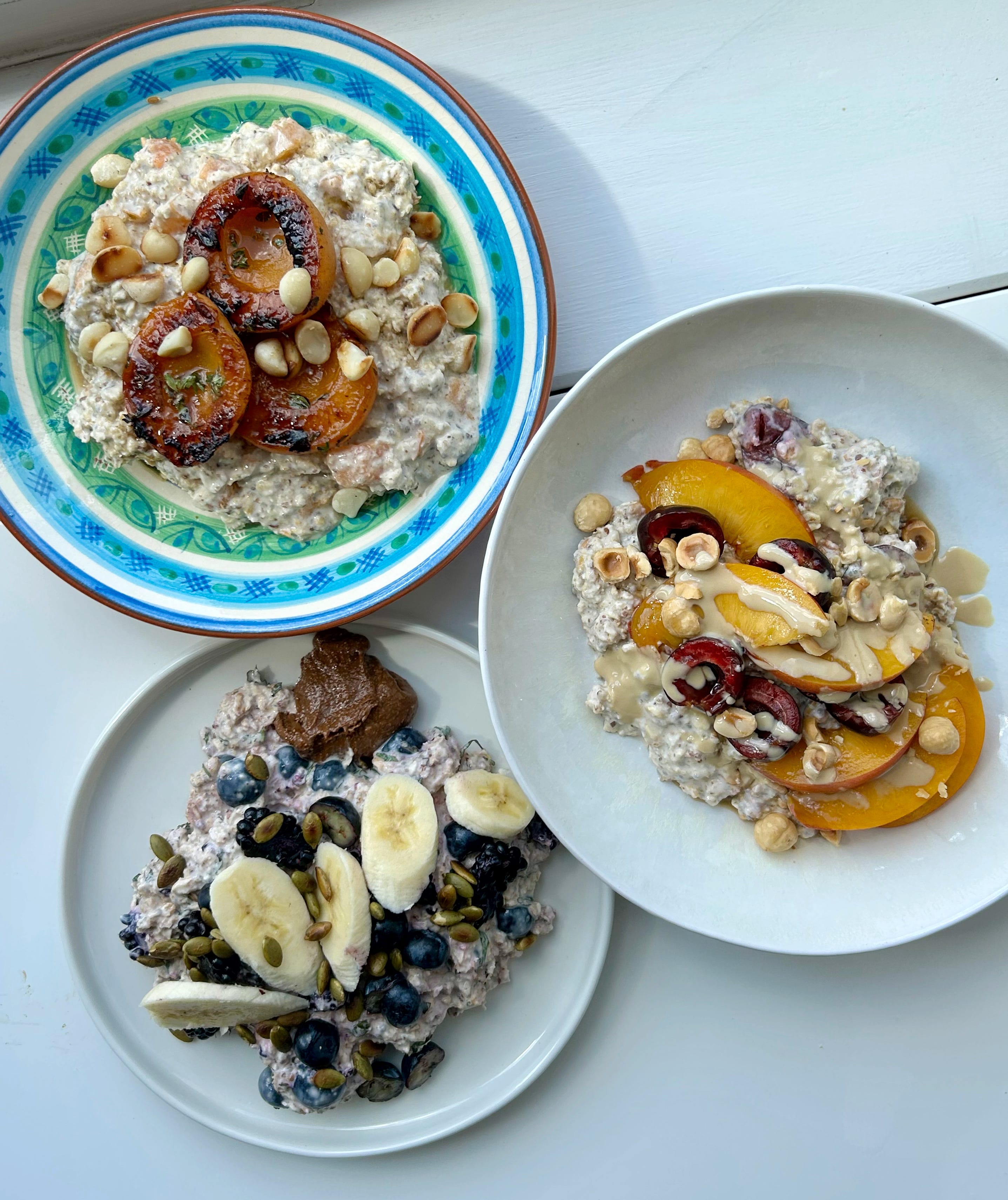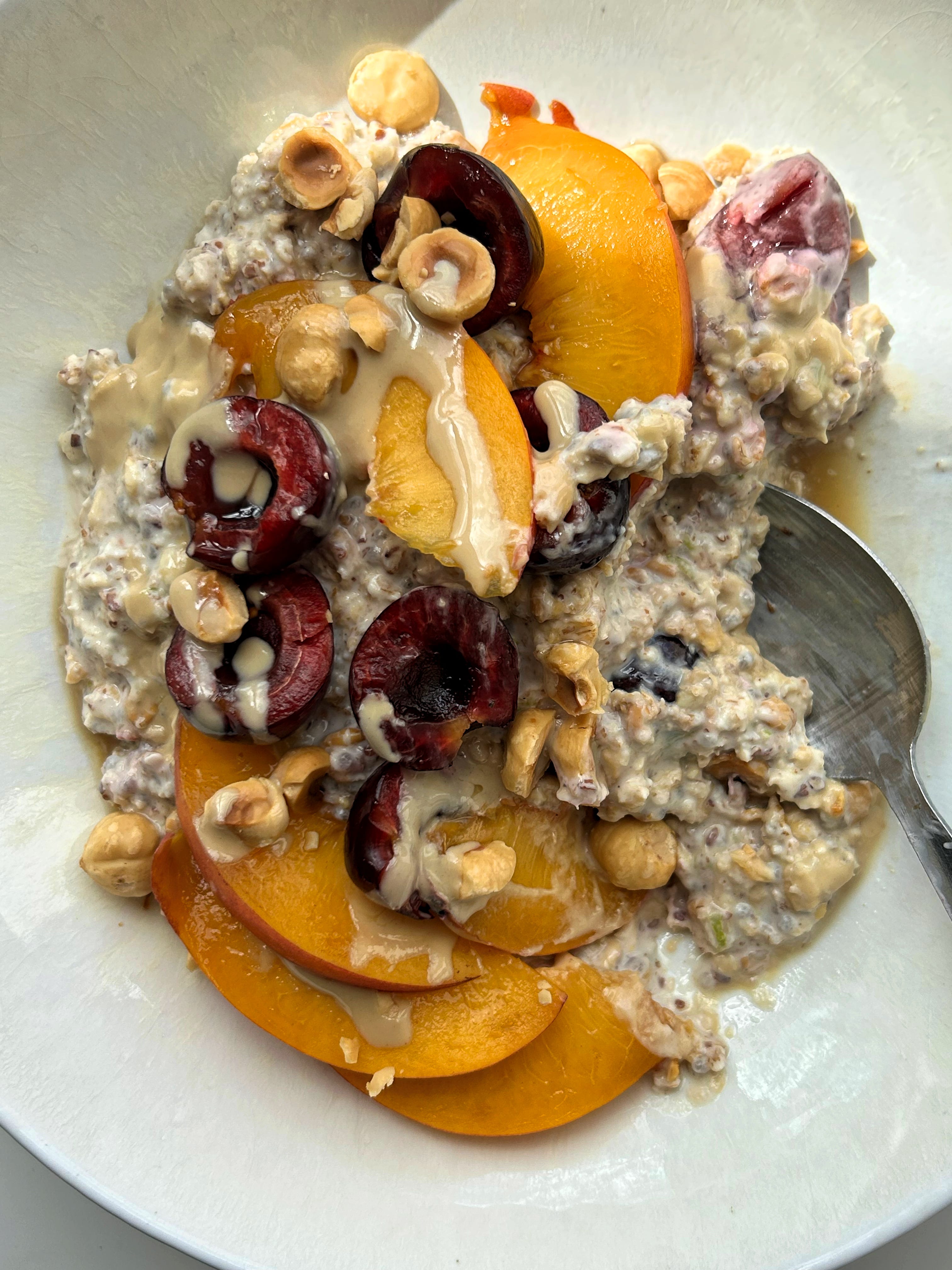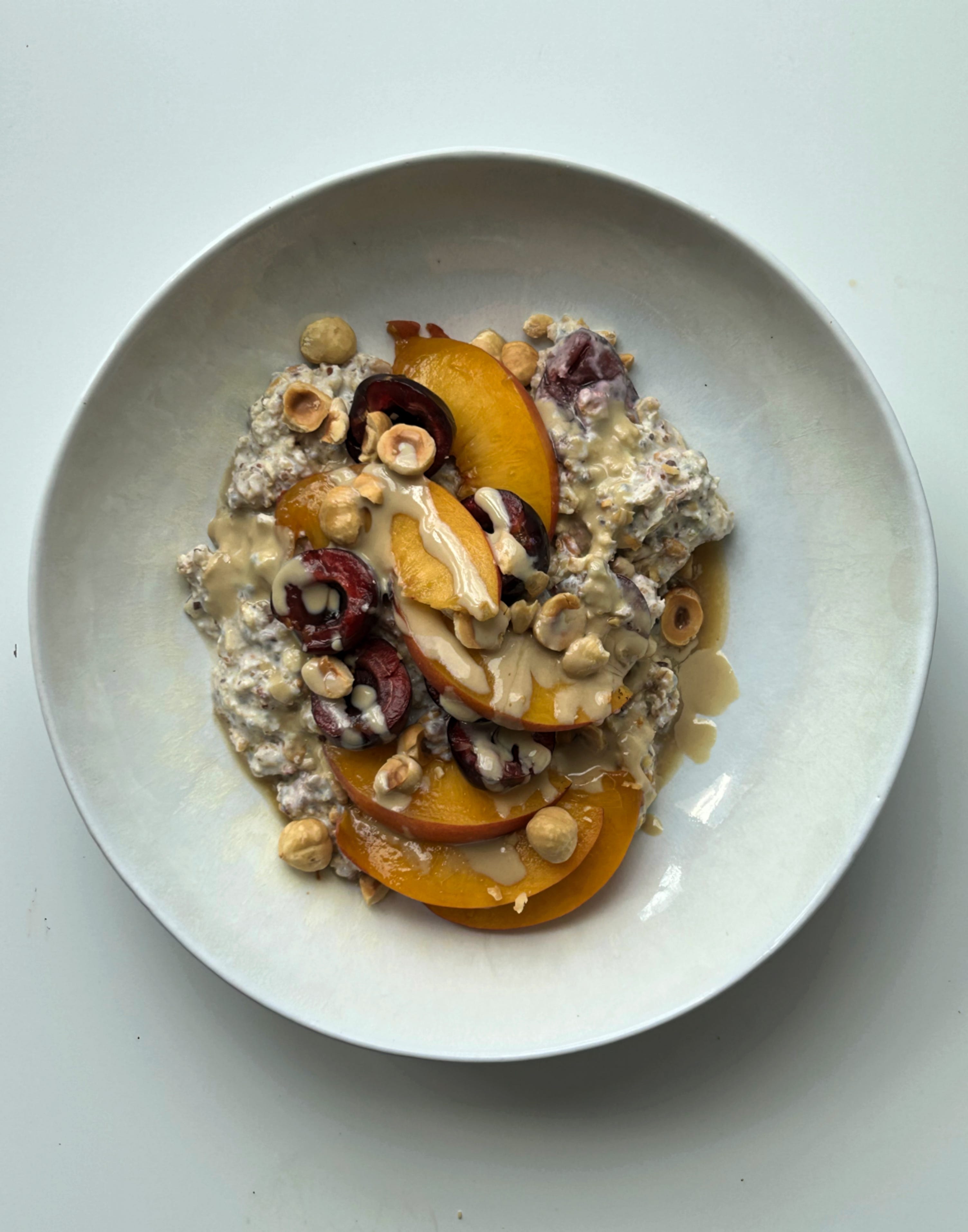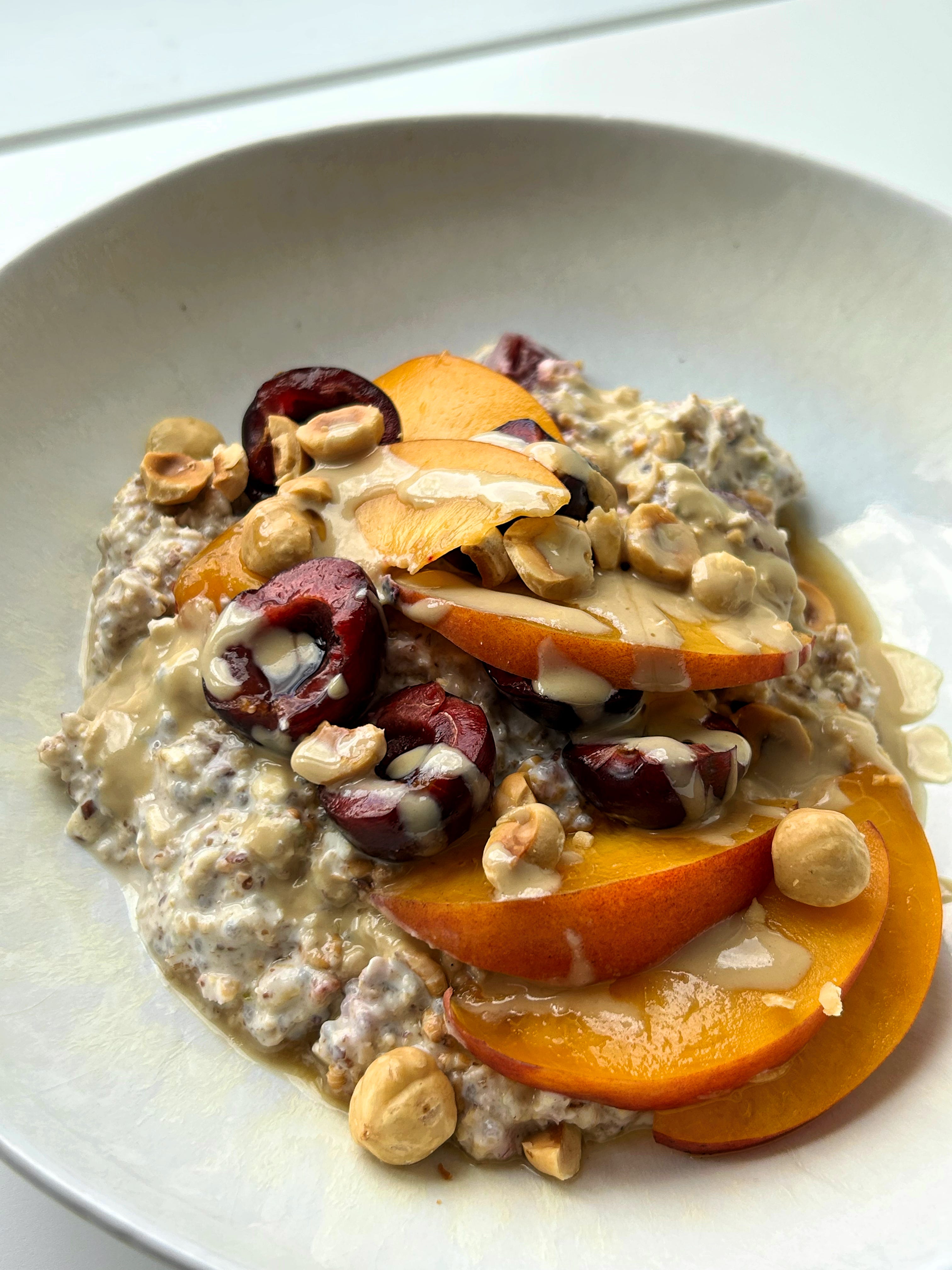 Extra cherries, sliced peaches, toasted hazelnuts, drizzle of tahini & maple syrup